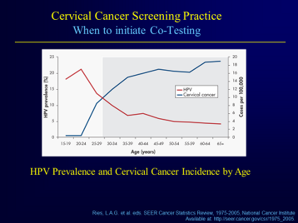 Here you see the prevalence of HPV versus the incidence of cervical cancer by age. HPV prevalence declines after reaching age 30. In contrast, cervical cancer incidence increases after age of 30. Therefore, it is very logical to introduce co-testing (i.e., cytology plus HPV testing) at age 30.