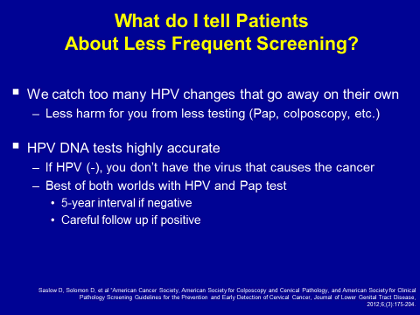 What do I tell patients about less frequent screening? We do not want to catch all the changes that will go away on their own. We will do less harm by doing fewer Pap tests, fewer colposcopies. HPV testing is so accurate, and I tell my patients, “When you are Pap-negative and HPV-negative you have virtually no risk of disease on your cervix for many years. And we may safely wait to rescreen you, which is now five years.”