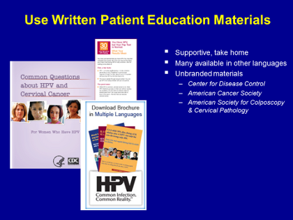 Use written materials in easily understood language, and there are so many that you may get off the Internet. There are many unbranded materials that support messages. We know that for many patients there is not a lot of information they take with them when the visit is over, so repetition and written materials are very helpful.