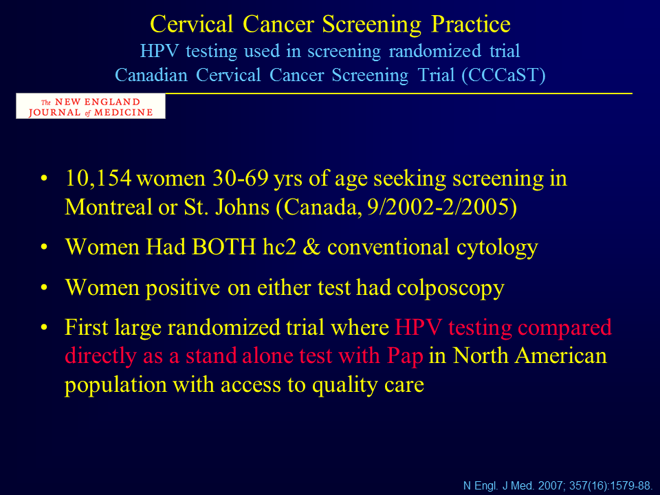 Study significance: First large randomized clinical trial where HPV testing compared as a stand-alone test to the Pap test in a North American population with access to quality care.