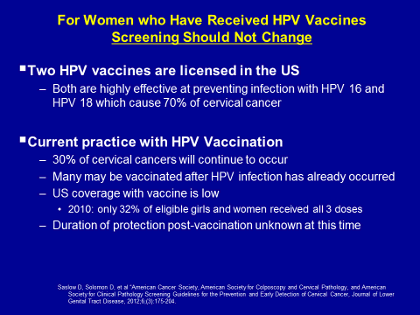 For women who have received HPV vaccination, there is no change in screening.  We have two HPV vaccines licensed in the U.S., and both contain HPV 16 and 18 virus-like particles.  They are not infectious, and these types are the cause of 70% of cervical cancer.