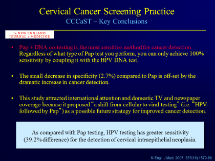 - This landmark study attracted a lot of attention because it proposed a potential shift from cellular methodology to viral molecular testing, i.e., use highly sensitive HPV DNA test for the first round of screening and perhaps follow by cytology (which as we recall, has high specificity, and clinical utility in those women who test HPV positive).