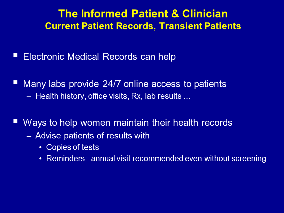 We need to help women know what is going on in their care. If you have a patient, and you are not using EMR, perhaps you can advise her of her results by giving her a copy of her results.
