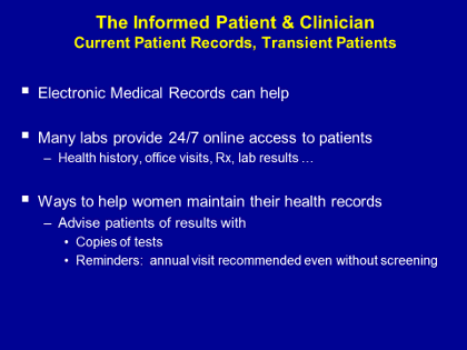 When we look at the transient nature of society, I have to wonder, “How will I know?” if I have a new patient who thinks she had a Pap, or isn’t sure if she has ever had an HPV test. Again, we can utilize and give patients a copy of their records.