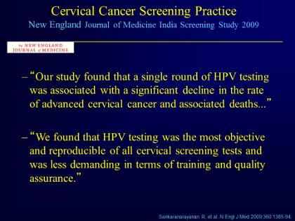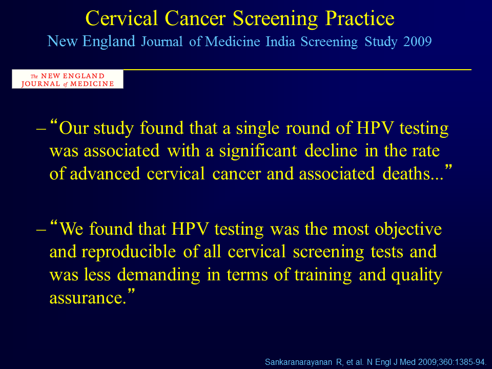 [61] Sankaranarayanan, R. et al. HPV screening for cervical cancer in rural India. N Engl J Med 2009; 360(14):1385-1394.