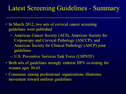 In March 2012, the ACS/ASCCP/ASCP and USPSTF Screening Guidelines were published. They both strongly