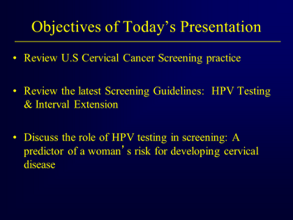 - The latest 2012 Screening Guidelines, including HPV DNA testing and testing Interval Extension.