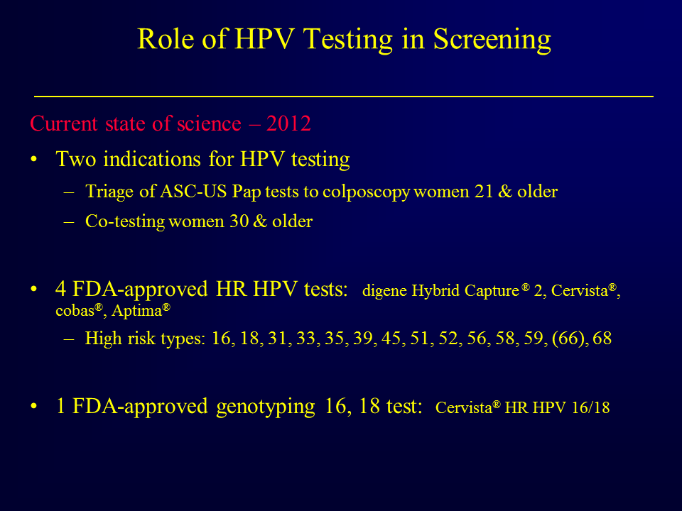 So, what is the current state of science in 2012 for HPV DNA testing? There are really two clinical indications