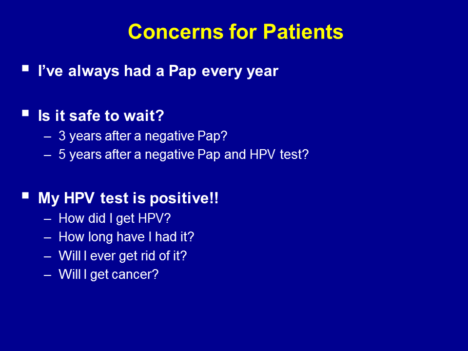 I think we can use the model of other disease entities that we screen for to help patients understand. Colonoscopy for example. No one questions if you are negative on a colonoscopy and no pre cancer, that you may wait 10 years. No one has had a problem with that. But the “problem” we face with cytology and screening is that we have done such a good job of teaching a Pap every year, the Pap has become the end-all and be-all of the annual exam, and we need to teach women that its not the end-all and be-all. That the annual exam, that the well woman visit, is a chance for clinicians to deal with everything from bone health vaginal health, cardiovascular risk prevention, and that the Pap may or may not be done based on previous history, knowledge of HPV status, and so on.
