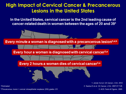 I created this slide to remind you that every minute a woman is diagnosed with a pre-cancerous cervical lesion in this country, and every hour a woman is diagnosed with cervical cancer, and every two hours a woman with cervical cancer dies. So this is a very important virus.