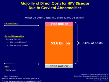 It is easy to get distracted. This virus not only causes cervical cancer, but it causes head and neck cancer, it causes anal cancer, it causes vulvar cancer, vaginal cancer, penile cancer, and of course, cervical cancer. The majority of the direct costs of HPV are related to cervical abnormalities, not from the cancers, but from the precancerous lesions that are involved in ultimately developing a cancer. This slide shows that 96% of the costs are related to cancer and cervical cancer abnormalities, and we are talking billions of dollars, so this is a virus that hurts people, not only their health, but also in our pocketbook.