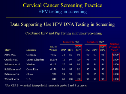 As a result, in the last decade, many clinical trials have explored the value of adding HPV testing to the Pap in cervical cancer screening. The table in this slide summarizes the results of those large clinical studies. In terms of sensitivity, when you combine the Pap test with the HPV test, the clinical sensitivity approaches 100%, with a very nice specificity of >90%.