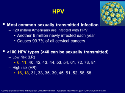 HPV, which stands for the human papilloma virus, is a double-stranded, 8 kilobase, DNA virus, and it infects all of us. Yes, maybe even you. Eighty percent of all sexually active women and men get this virus at one time in their lives. So what does that mean? It means that 20 million Americans are infected with HPV at any given time. Six million a year, and again, essentially all cervical cancers have this HPV viral gene integrated right into the chromosome of the cancer. So the good news is, we get this virus; most women or men never knew they had it and get over it, and we will talk about that. It is important that you also realize that not every virus has the same seriousness, if you will. We have low-risk viruses, and I listed them here on this slide. We also have high-risk viruses that are also listed. Low-risk viruses cause warts, and I will get into that, and high-risk viruses cause cancer. I put here in yellow, 6 and 11 are the most common low-risk types, and 16 and 18 are the most common high-risk types because those are the four types that are currently integrated into the HPV vaccine.