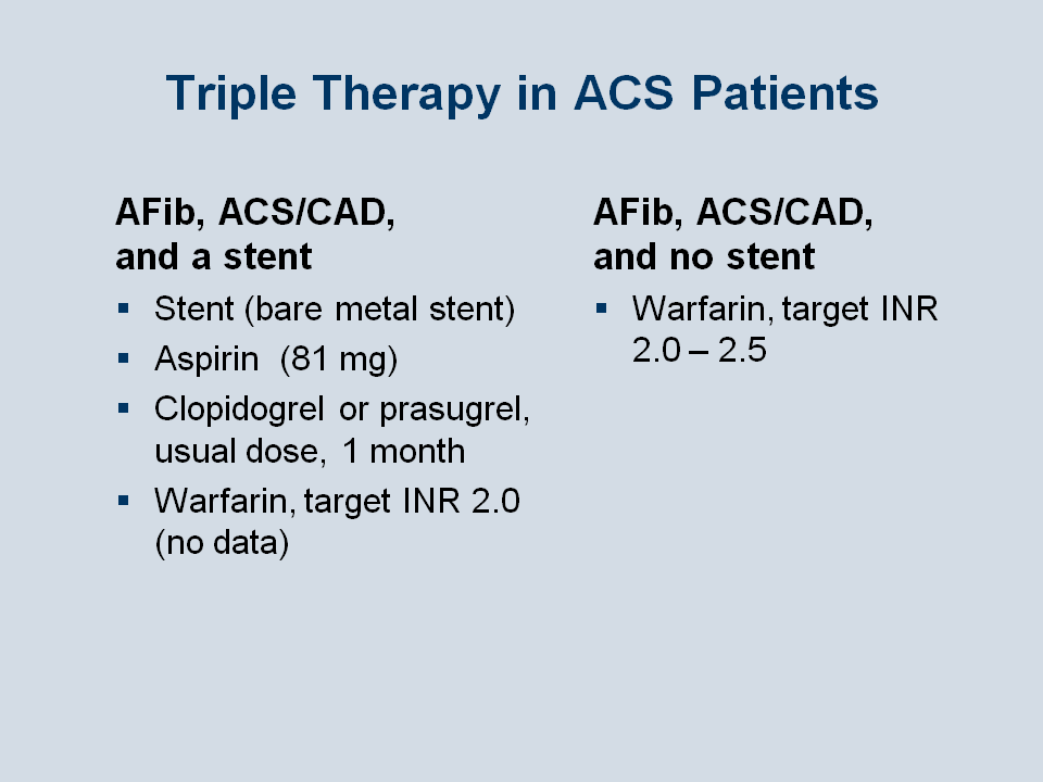 Across the board in patients with ACS and underlying CAD who also have AFib and are treat with a bare-metal stent, then physicians has some leeway in choosing the best treatment regimen. Most of our patients, however, are candidates for drug-eluting stents, and as a result the clinical decision making becomes a much more difficult process.