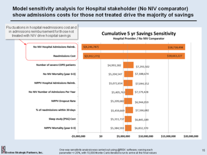 Model sensitivity analysis for Hospital stakeholder (No NIV comparator) show admissions costs for those not treated drive the majority of savings