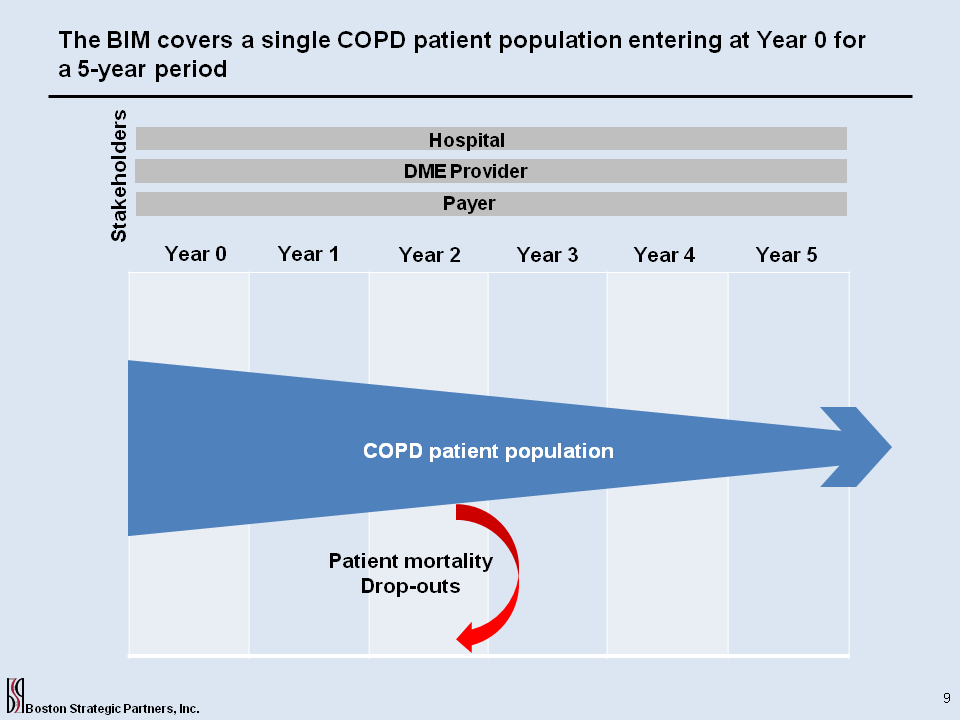 The BIM covers a single COPD patient population entering at Year 0 for a 5-year period