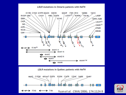 This Figure from the lab of Rob Hegele, who has done a lot of sequencing in patients from Ontario and Quebec with heterozygous FH, illustrates the wide spectrum of different mutations that are found in patients with heterozygous FH. This illustrates how many different mutations result in loss-of-function of the LDL receptor and underlines why simply genotyping for one specific mutation is not sufficient. In fact, sequencing of the exons, of the coding portion of the gene, is really necessary in order to do molecular diagnosis of FH. Importantly, major gene deletions or rearrangements are not detected by routine sequencing of the exons.