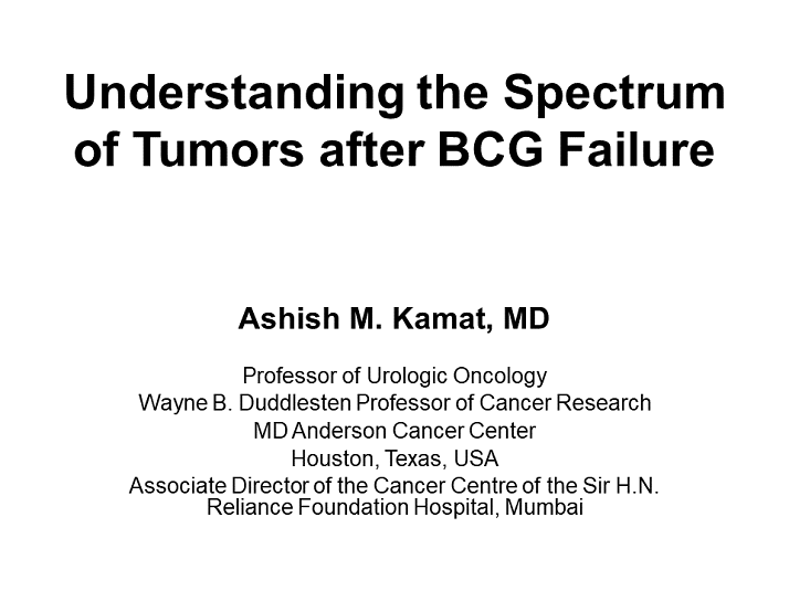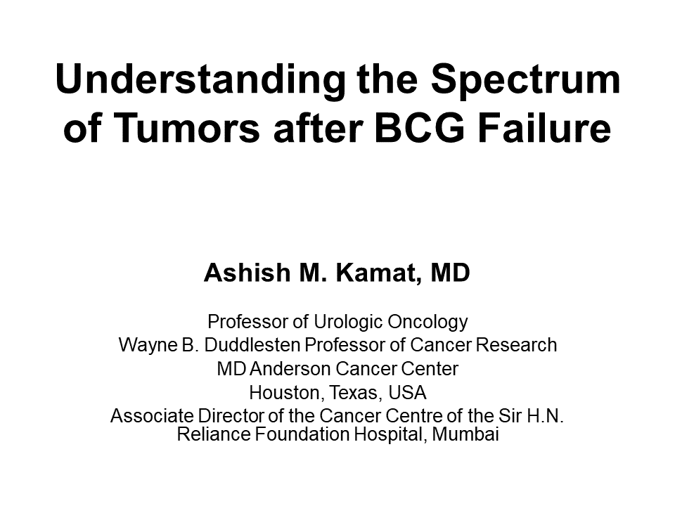 FIG. 1: My name is Ashish Kamat. I am professor of urologic oncology and the Wayne B. Duddlesten Professor of Cancer Research at the University of Texas MD Anderson Cancer Center and associate director of the Cancer Centre at the Sir H.N. Reliance Foundation Hospital in Mumbai, India. This presentation will address understanding the spectrum of tumors after bacillus Calmette-Guérin (BCG) failure.