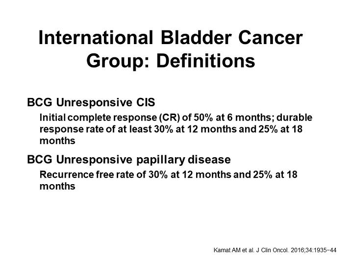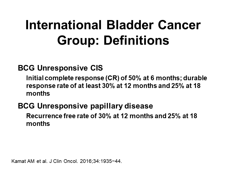 FIG. 24: Since it is crucial in single-arm studies to have benchmarks that the community and regulatory bodies can agree on, the IBCG has provided these benchmarks, based on studies such as those described earlier and others from the EORTC.[21] For patients who are BCG-unresponsive and have CIS, an initial complete response rate of 50% at 6 months should be considered clinically relevant, and this should be durable to ≥30% at 12 months and 25% at 18 months. For patients who are BCG-unresponsive and have papillary disease, the recurrence-free rate should be ≥30% at 12 months and 25% at 18 months.