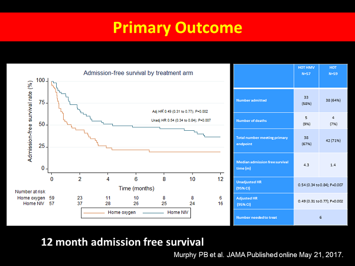 Murphy PB, Rehal S, Arbane G, et al. Effect of home noninvasive ventilation with oxygen therapy vs oxygen therapy alone on hospital readmission or death after an acute COPD exacerbation: a randomized clinical trial. JAMA. Published online May 21, 2017. doi:10.1001/jama.2017.4451.