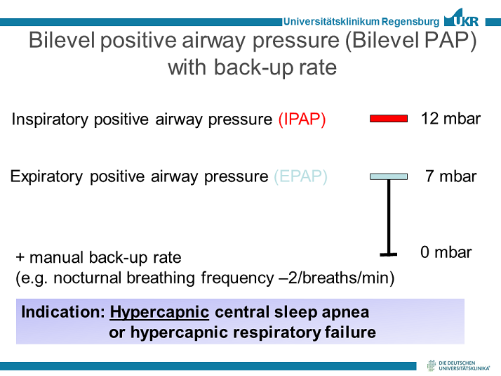 FIG. 14: What about BiPAP with backup rate? In BiPAP there is positive expiratory positive airway pressure (EPAP) that, like CPAP, is responsible for keeping the upper airway open. But in addition to EPAP, there is inspiratory positive airway pressure (IPAP) support that is able to ventilate the patient, eg, during CSA. For this ventilation in a patient during CSA, it is necessary to manually set a backup rate that kicks in during episodes of CSA.