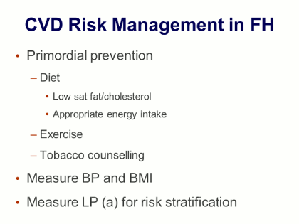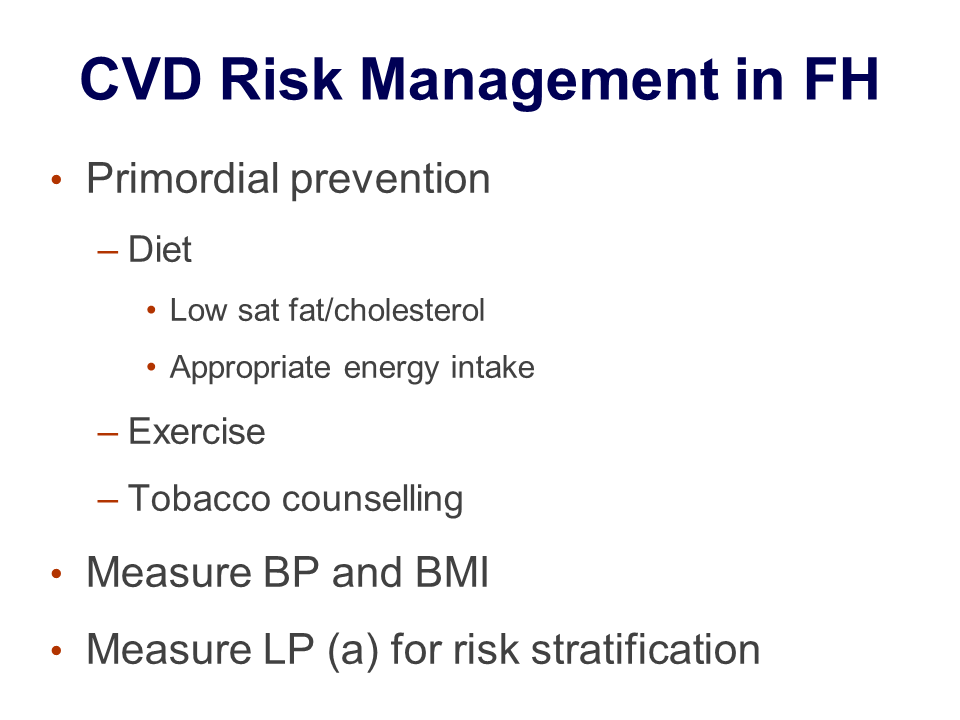 The conclusion from the preceding data emphasizes that assessment and management of overall CVD risk in FH is particularly critical. Diet, including a diet low in saturated fat and low in cholesterol, with appropriate energy intake to maintain body weight, are the mainstays of this risk management. Regular exercise and anti-tobacco counseling is also extremely important. The physician should be regularly monitoring blood pressure and body mass index and counseling or managing those problems appropriately. Finally, the FNLA also recommended measuring lipoprotein(a) (Lp(a), “lipoprotein little a”) for risk stratification.