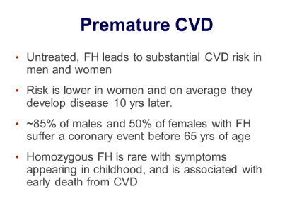 As listed in this Figure, if undiagnosed and untreated, FH leads to substantial risk of premature CVD events in men and women. The risk is lower in women who, on average, develop manifestations of CVD 10 years later than men. However, about 85% of men and about 50% of women with FH experience a coronary event before the age of 65. The CVD symptoms occur even earlier in the much rarer homozygous FH, even as early as childhood, and if untreated, their FH is associated with even earlier death from CVD.
