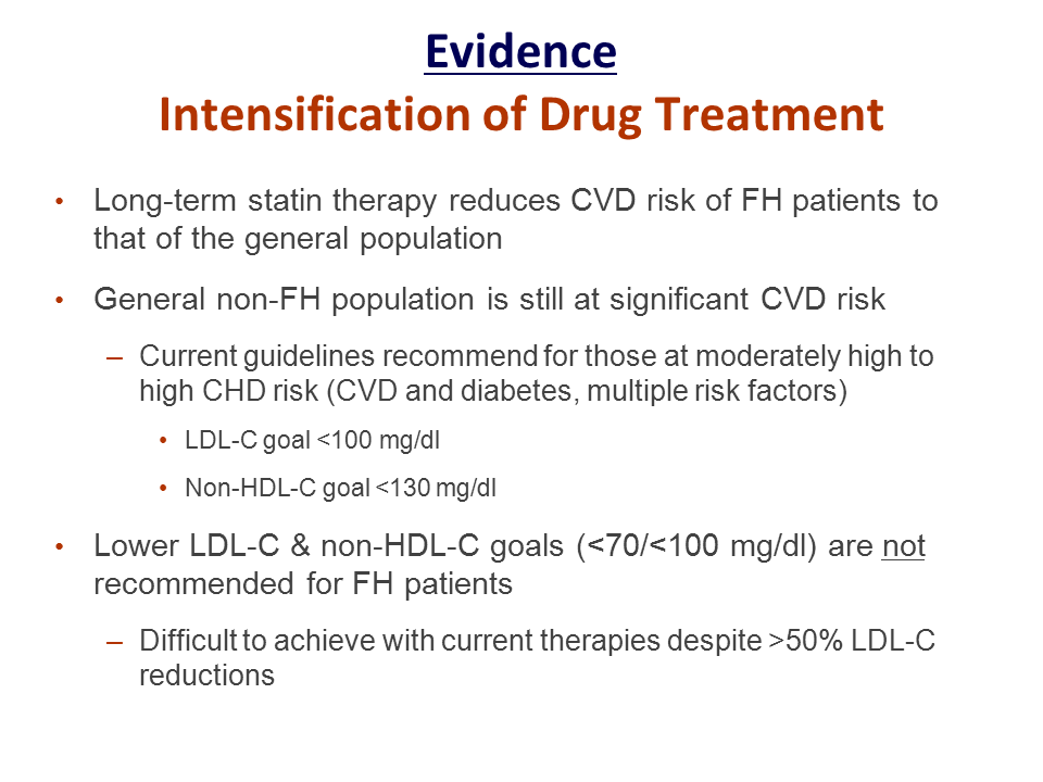 In terms of the evidence for intensification of drug therapy to an LDL goal <100 mg/ dL, is this sufficient? This raises the issue of the limits of cholesterol lowering therapy in general. As discussed in Figure 6, above, long-term statin treatment in FH patients can lower their atherosclerotic burden (as assessed by cIMT) and CHD risk to that in the general population, which would ostensibly have to count as “success.” On the other hand, population statistics reveal that the general population still has a very high risk of CHD. This suggests that in all patients at increased risk, with ≥2 risk factors, and certainly in FH patients, an LDL goal of <100 mg/dL represents a reasonable target to be achieved with intensification of treatment.