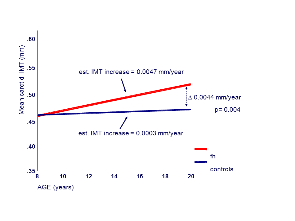 Just in case there is any doubt as to why we need to start monitoring lipid values already at 10 years of age, the Figure shows the rate of change in carotid intramedial thickness (cIMT), comparing children with the genetic diagnosis of FH with their unaffected siblings. At about age 8 to 10 there is an increase in cIMT that is more rapid in those affected with FH. In fact, after age 10, cIMT increases at about 3 times the rate in children with FH versus children without – and this clearly illustrates the reason for the recommendation to begin treating children with FH already at the young age of 10.
