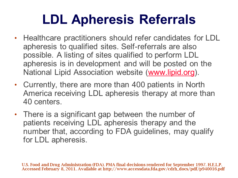 Currently there are only about 400 patients receiving LDL apheresis in the United States, whereas it is estimated that >6,000 individuals would qualify for LDL apheresis. This suggests that there is a significant gap between the number of patients receiving LDL apheresis therapy and the numbers who qualify according to the FDA guidelines. As a result, physicians should be encouraged to refer candidate patients to a qualified LDL apheresis center; the Figure shows the URL for the NLA website, www.lipid.org, and clicking on that Web link will reveal a list of qualified sites for LDL apheresis.