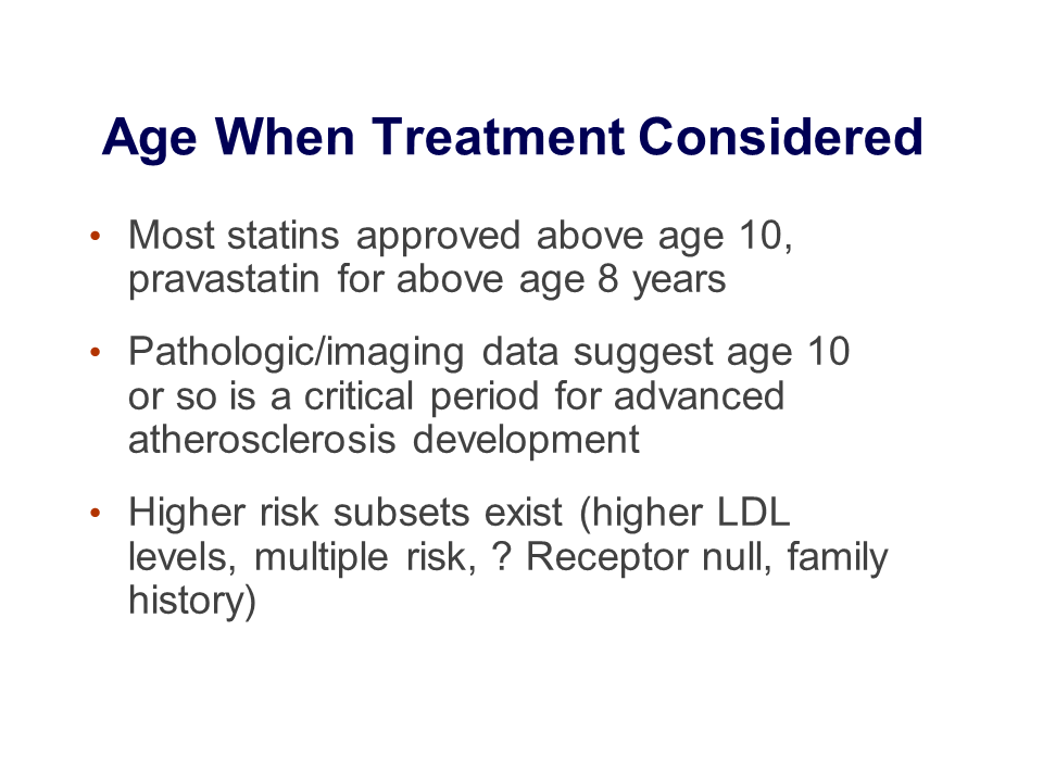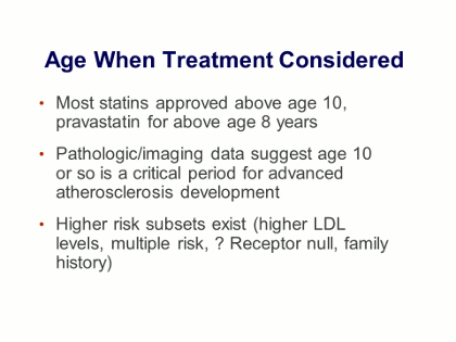Most statins are now currently approved for children over the age of 10, and pravastatin is approved in the United States after age 8 years. As we have seen in the preceding Figures, the pathologic and imaging data suggest that starting at about age 10 is a critical period for advanced atherosclerosis development. There may be higher risk subsets in whom you want to treat at an earlier age than 10. These include those with extreme elevations of LDL cholesterol, the presence of multiple risk factors, the possibility of the receptor null mutation, and also those with a particularly malignant family history.
