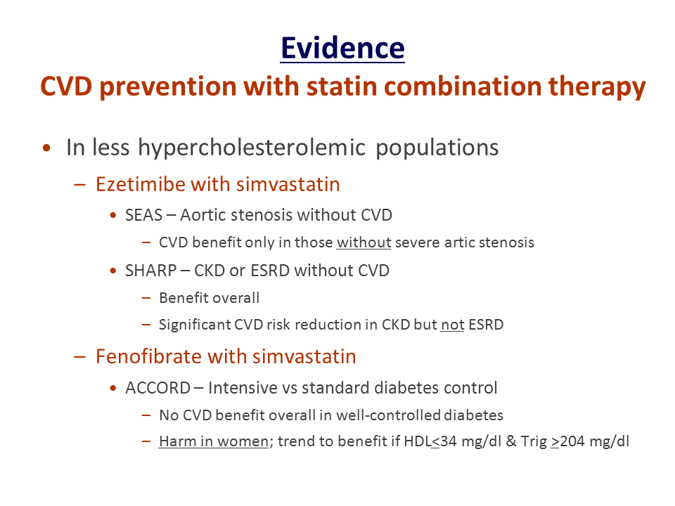The only other clinical trial evidence for combination therapy with a statin comes from the Action to Control Cardiovascular Risk in Diabetes (ACCORD) trial,[17] assessing addition of a fenofibrate to treatment with simvastatin. Overall the study result was negative when fenofibrate was added to simvastatin compared to simvastatin alone, but there was a trend toward benefit in those with high triglycerides and low HDL.