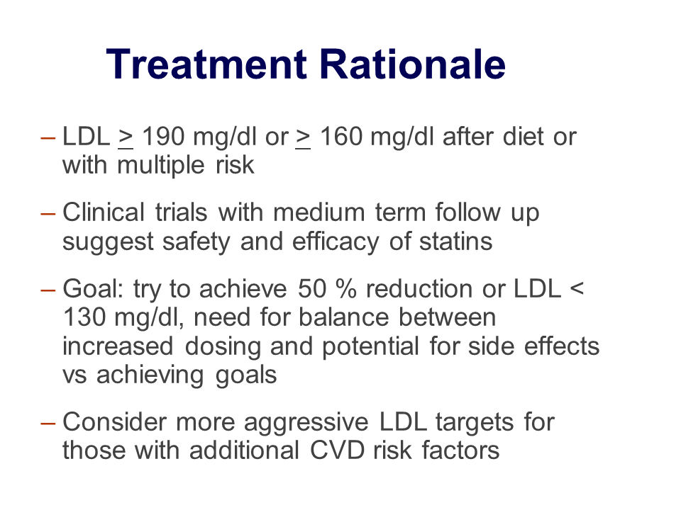 - begin treatment above age 8-10 years in anybody with serum LDL cholesterol