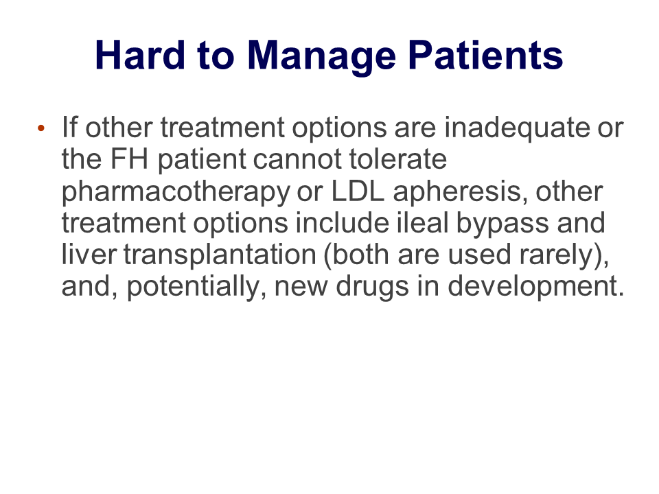 Finally, what about hard-to-manage patients, patients who do not respond or patients who are intolerant to pharmacologic therapy or LDL apheresis? For FH patients such as these, ileal bypass surgery has been done, and there is a prospective, randomized trial, the Program on the Surgical Control of the Hyperlipidemias (POSCH),[27] that was conducted many years ago. In this trial 838 women with a previous history of myocardial infarction were randomized to diet or diet plus ileal bypass surgery and then followed for about 5 years. The result was a a 38% reduction in LDL cholesterol accompanied by a significant reduction in total mortality and CHD events, as well as regression of coronary lesions.