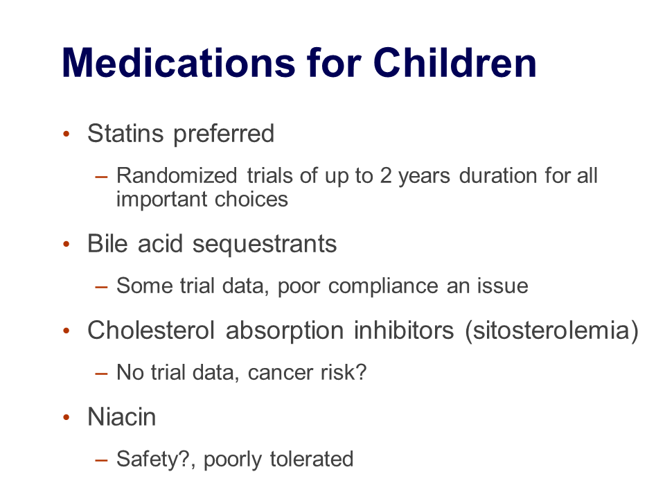 Bearing in mind that it is important to think about the goal of a 50% reduction in LDL cholesterol without exposing a child to excessive medication, it is still the case that in terms of choosing medications, statins are currently the preferred treatment choice. The randomized trial data of up to 2 years duration suggest that statins are safe, and this is true for all of the important statins.