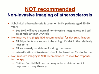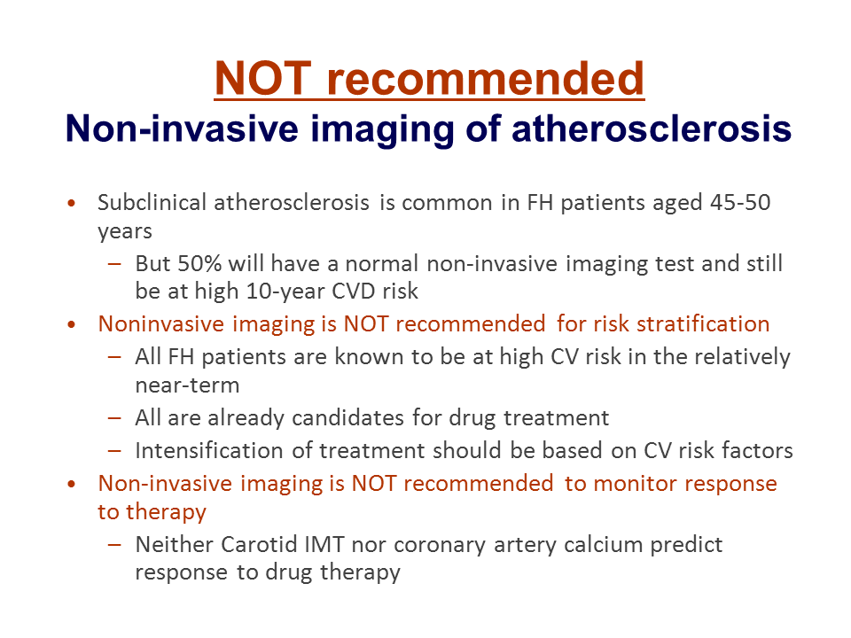 Finally, the FNLA recommended that noninvasive imaging for atherosclerosis should not be performed in FH patients. Again, the reasoning was that basically subclinical atherosclerosis in FH patients is very common. On the other hand, half of FH patients may have a normal noninvasive test, whether a coronary artery calcium score or carotid IMT, and then go on and have a CHD event within the next 5 years. Therefore it does not make any difference whether there is a positive noninvasive test score or not; every FH patients should still be treated with drugs, with intensification based on the number of additional risk factors. Obviously, if one of your patients does undergo noninvasive imaging and the result is positive, then you might decide to intensify therapy even more – but if the noninvasive test score should be negative or suggest the absence of atherosclerosis, it should be ignored and should not be a factor at all in your clinical decision making.