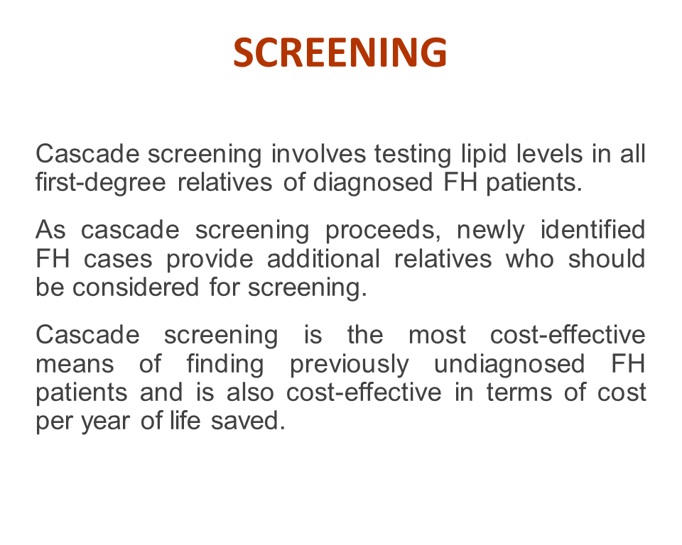 Cascade screening involves testing lipid levels in all first-degree relatives of diagnosed FH patients. As cascade screening proceeds, the occurrence of newly identified FH cases will provide additional relatives who should be considered for screening. Cascade screening has been shown to be the most cost effective means of finding previously undiagnosed FH patients and is also cost effective in terms of cost per year of life saved.