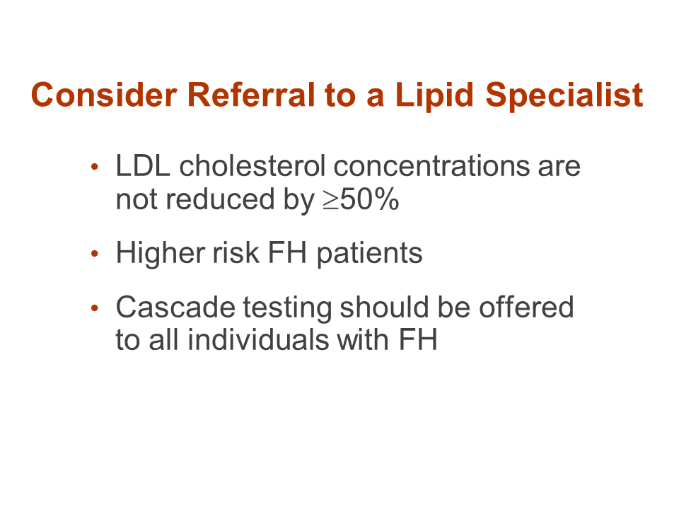 In addition, the FNLA recommends cascade screening, meaning that when you find an index patient you then find and assess all their first-degree relatives, ie, brothers, sisters, children – all should have fasting lipid panels, and as each additional new case appears, this means continuing to screen additional family members to try to ensure that people are identified and treated at a young age. If you do not have the ability to do that in your own office, a lipid specialist certainly should be able to help facilitate that, because basically we recommend starting with this important first step to try to prevent the adverse consequences of a really severe genetic disorder. J Clin Lipidol. 2011; 5(6).