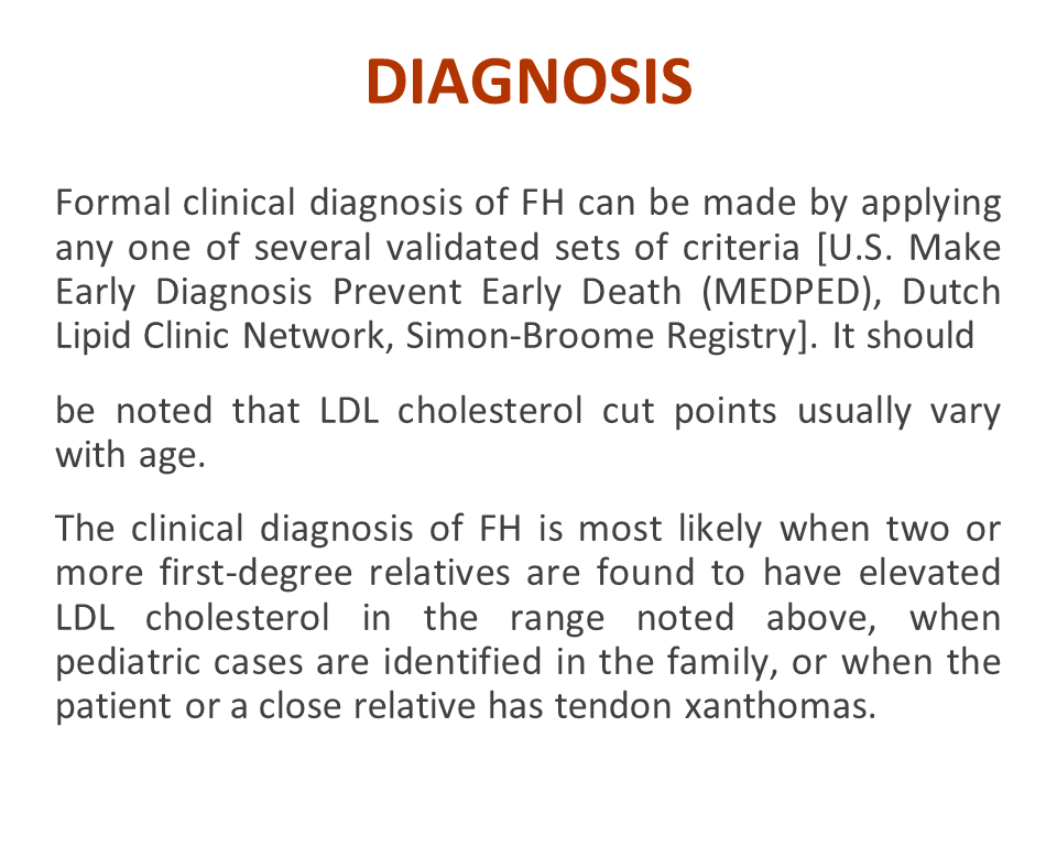 Formal clinical diagnosis of FH can be made by applying any one of several validated