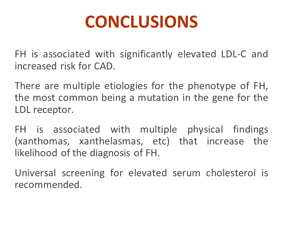 In conclusion, FH is associated with significantly elevated serum LDL cholesterol levels and increased risk for CAD. This escalated risk for CAD is proportional to the magnitude of lifetime elevation in LDL cholesterol, and on average in patients with FH, the risk for premature CAD is approximately 20-fold higher compared to patients without FH.