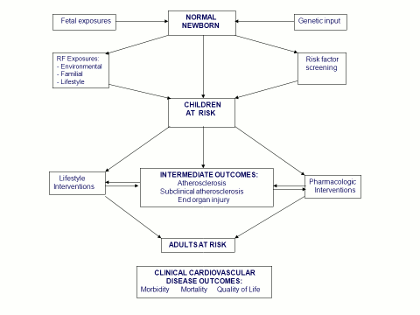 As shown in this Figure, there are 2 sets of factors that impinge on a “normal” person’s life, from birth to end of life: environmental factors and genetic factors. Likewise these 2 sets of factors affect the 2 major divisions in that lifetime, childhood and adulthood, to create childhood risks and outcomes, then adult risks and outcomes. Familial hypercholesterolemia (FH) is an example of an inborn, genetic risk factor: people born with FH either totally lack functional low-density lipoprotein (LDL) receptors (homozygous FH) or partially lack them (heterozygous FH). These genetic defects will lead to serious deleterious outcomes in adulthood, but this serves to emphasize the importance of recognizing and treating this condition as early as possible in people affected with this mutation. In May 2011 the Foundation of the National Lipid Association (FNLA) published new diagnosis and treatment recommendations for physicians treating patients with inherited FH, and as the Figure suggests, the first question may be, Why is recognizing FH in children of primary importance?