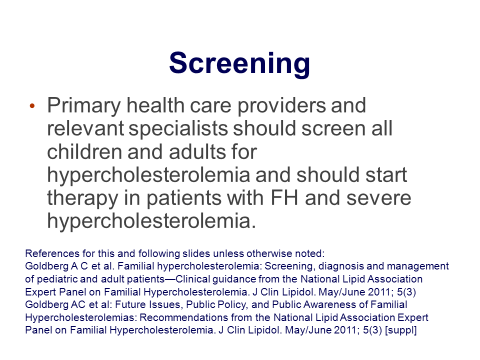 Screening patients for the possible presence of FH is an important part of the policy initiative of the National Lipid Association (NLA) for raising awareness of, and decreasing the disease risk and morbidity from, FH. FH is a relatively common but eminently treatable disorder associated with a high risk for development of CHD events. FH meets the World Health Organization (WHO) criteria for conducting systematic screening, which further underlines the NLA’s recommendation that primary healthcare providers and relevant specialists should screen all children and adults for hypercholesterolemia if there is any cause for suspicion of the presence of FH. In addition, all patients with FH and severe hypercholesterolemia should immediately begin treatment according to the recommended strategies.
