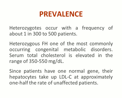 As seen in the Figure, heterozygous FH is one of the most commonly occurring congenital metabolic disorders worldwide, occurring with a frequency of about 1 in 300-500 patients. Throughout the world approximately 10 million people have heterozygous FH. The average serum total cholesterol in these patients is in the range of 350-550 mg/dL – in other words, severely elevated, when “normal” total cholesterol should be <200 mg/dL. Since heterozygotes have one normal gene (and about half of the normal number of LDLRs), this means that their hepatocytes take up LDL cholesterol at approximately one half the rate of unaffected patients. J Clin Lipidol. 2011; 5(6).
