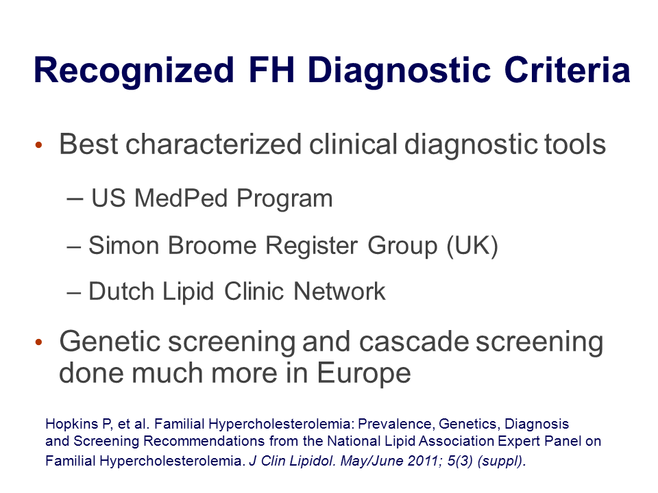 As shown in this Figure, there are recognized FH diagnostic criteria. The best characterized clinical diagnosed tools come from the US MEDPED (Make Early Diagnosis to Prevent Early Deaths) program,[1] the Simon Broome Register Group[2] from the United Kingdom, and the Dutch Lipid Clinic Network.[3] Genetic screening and cascade screening are both done much more in Europe than are currently being done in the United States. In the United States, screening for FH usually involves