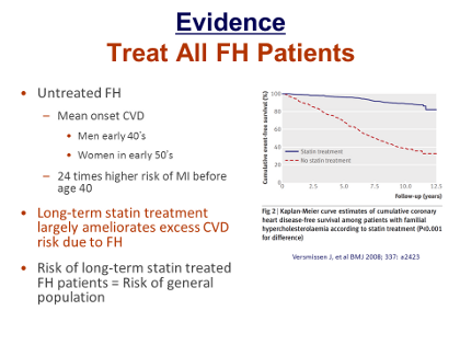 The principal implication of the FNLA’s first recommendation is that physicians should understand that basically all FH patients will require consideration for a life-long treatment plan. Probably the most compelling evidence for this assertion comes from the Dutch Lipid Clinic Network,[5] which has done a very good job in The Netherlands of finding both individuals with FH and their relatives and treating them with effective drug treatment strategies for >20 years. In the Figure that the top blue line represents the event-free survival of individuals who have received long-term statin therapy; the lower, dashed red line are the event-free survival rates in those individuals in the pre- statin therapy era of this registry who were not prescribed a statin. The immediate and large divergence of the 2 curves shows unequivocally that the patients in the “placebo” group, ie, these historically untreated FH patients, had very high event rates and a very low level of event-free survival, even over a relatively short period of 12 years. Since the time when these data were collected it has become clear that it is not ethical to withhold efficacious treatment (ie, statins, in this case) from people with FH, and therefore the best available evidence is really only this quite robust observational data, demonstrating that