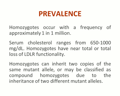 Homozygous FH occurs with a frequency of approximately 1 in 1 million persons. Serum total cholesterol levels in these patients range from 650 to 1000 mg/dL. Clearly, in these persons both total and LDL cholesterol are severely elevated, with the result that these patients have a dramatic elevation in lifetime risk for developing coronary artery disease (CAD) as well as other forms of atherosclerotic disease. As a further clarification, patients can have homozygous FH because they inherit 2 copies of the same mutant allele, or may be classified as “compound homozygotes” due to the inheritance of 2 different mutant alleles.