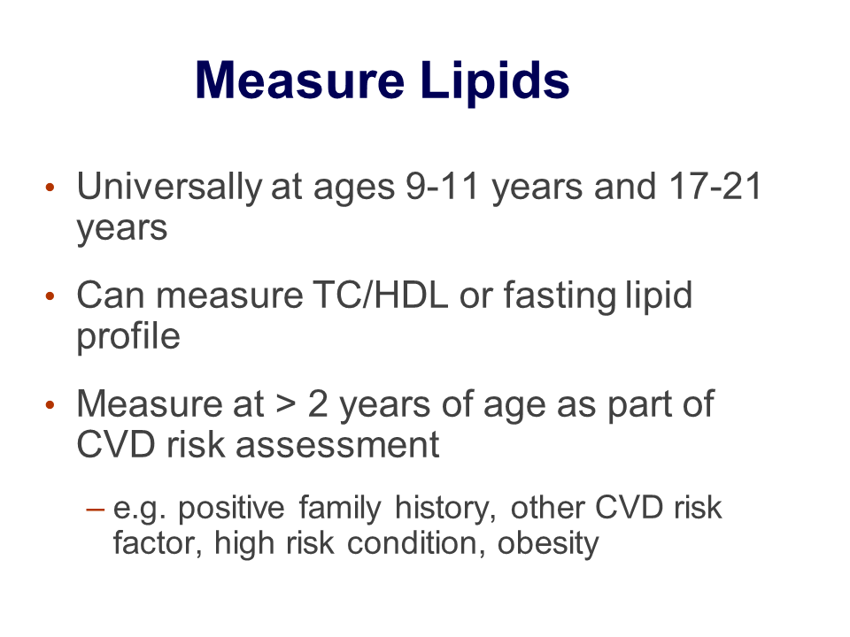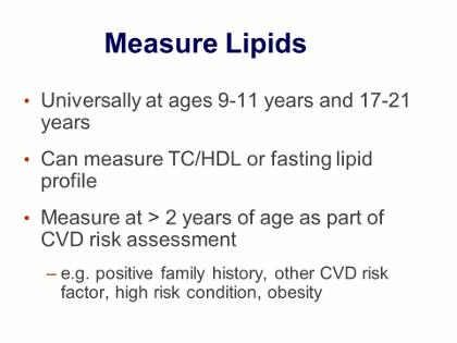 The screening can be done by ordering a routine total cholesterol and HDL cholesterol non-fasting or fasting lipid profile, but this should be done in all children around the age of 10. In addition, however, physicians should consider measuring lipids at any age above 2 years if: