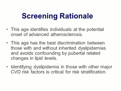 In reaching this recommendation for early and universal screening to detect advanced or genetically determined hypercholesterolemia, the FNLA committee carefully considered the rationale for this timing of lipid measurement. The first consideration was that this age, 9 - 11 years, identifies those individuals with the potential onset of advanced atherosclerosis. This age also has the best discrimination between those with or without inherited dyslipidemias and avoids confounding by puberty-related changes in lipid levels. As children progress into the teenage years, other causes of significant cholesterol elevations impinge, especially environmental and behavioral factors that may be more important on the progress of the hypercholesterolemic condition than the pathologic processes themselves. The younger the child, the more an LDL level of 160 mg/dL will discriminate between children who do or do not have FH.