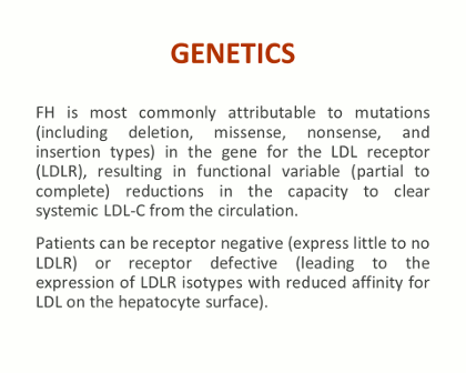 FH is caused by genetic mutations – either deletions, missense, nonsense, as well as insertion types of mutations – in the gene for the LDL receptor, and the result is a variable loss of function, which can be partial to complete in the ability of the LDL receptor to bind, take up, and clear cholesterol from the LDL particles in the circulation. Patients can be receptor defective, which leads to the expression of LDL receptor isotypes with reduced affinity for LDL on the hepatocyte surface, or receptor negative, in which case they express few to no functional LDL receptors.