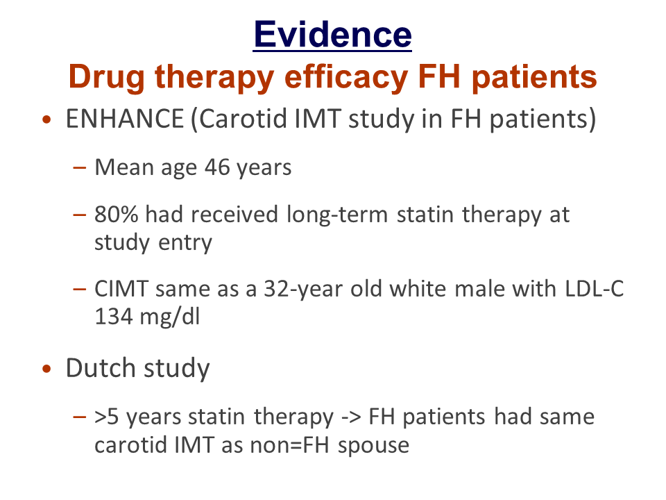 If we look at the primary characteristics of patients in the Ezetimibe and Simvastatin in Hypercholesterolemia Enhances Atherosclerosis Regression (ENHANCE) study[11] there is an important lesson for our understanding of FH patients, having nothing to do with the hypothesis that was tested in that trial or with the results. ENHANCE was an imaging study of the intimal medial thickness (IMT) of the carotid artery (carotid IMT, or cIMT) in patients treated with a statin or with a statin plus an intestinal cholesterol absorption inhibitor in widespread clinical use (ezetimibe). The design of the trial, the methodology, and the interpretation of the results are fairly well known and still the subject of ongoing discussion and debate. There are, however, a couple of interesting and important points from the trial that physicians should bear in mind when thinking about their FH patients.